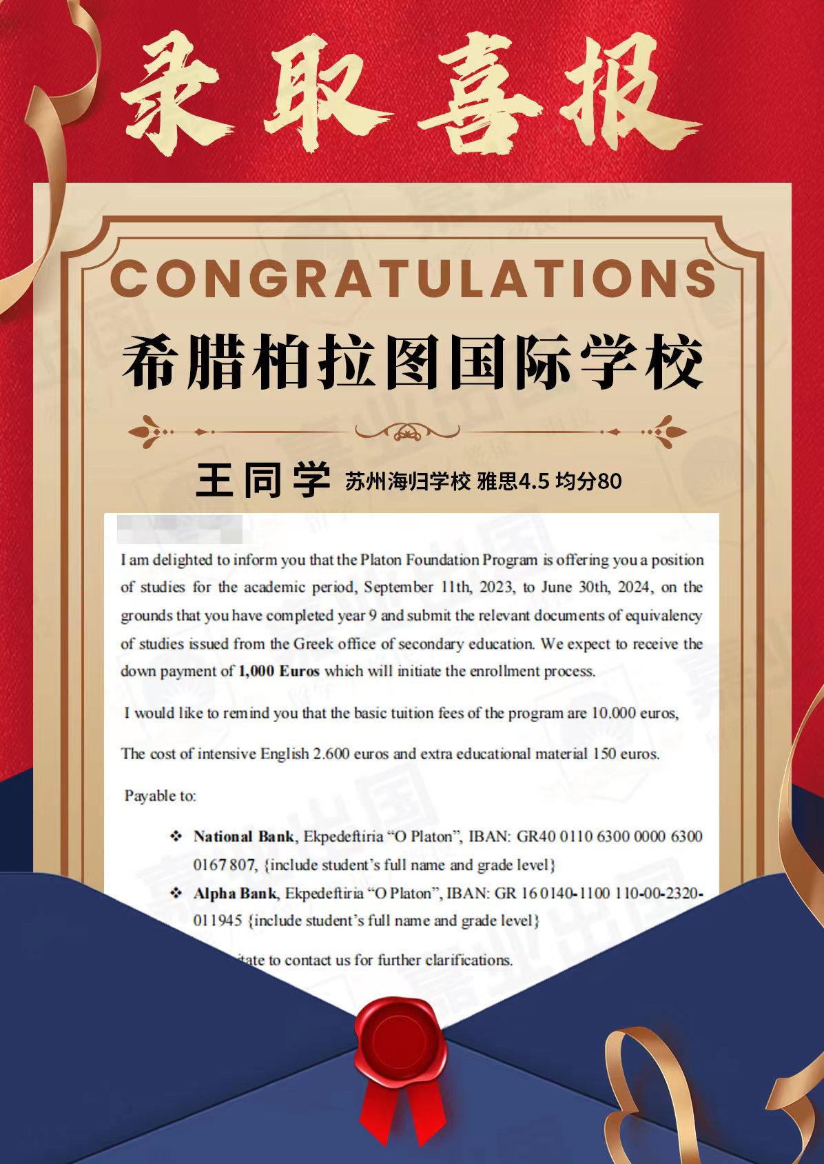 謝同學、王同學是一組家庭中的姐姐弟弟,在海歸子女學校就讀至8年級,9年級時轉到蘇州德佩斯中學校后,父母打算讓孩子去希臘讀書,接受純正的國際化教育。因為從小在國際學校上學,所以兩名孩子英文能力比較突出,但是面試能力薄弱,經過和家長溝通,建議提前一年做申請規劃,在面試輔導方面著重提升,同時把學科內容鞏固扎實,并且在興趣愛好方面鼓勵孩子多參加學校和課外的活動,最后在假期為孩子提供社會實踐活動的機會,孩子在學習和參與活動的過程中,掌握了面試技巧,收獲了自信!一年后申請到希臘學校10年級,順利拿到offer。