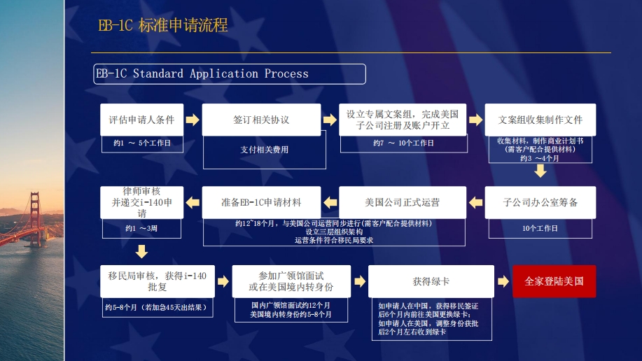 EB-1C跨國高管移民:是以工作關系為基礎的移民申請,面向高管和職業經理人。作為第一優先類別移民,不需要申請勞工證,是商業人士、企業家和高管申請美國移民的快速通道。一經批準,主申請人、配偶及未滿21歲以下子女即可赴美,一步到位獲得永久綠卡。